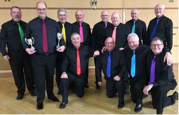 The victorious members that night were (below l to r) Chris Dobbins, Eddie Howell, Bob Carter, Derek Styles, Dave Wilkinson, John Franks, Chris Hartwright (MD), Mike Gearey, Andy Parsloe, Jim Cook, Ian Fothergill, Clive Woods, and Colin Pemberton.