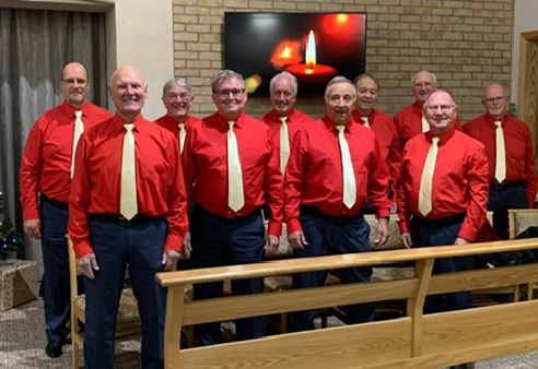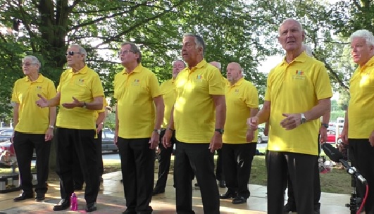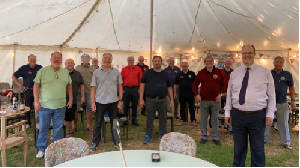 In August 2021 we resumed indoor rehearsals at our "home", the St Andrew's Centre in Pershore and we were able to again entertain (below, in our new formal red shirts) the caravanners of the Rotary club , at the Three Counties Showground, raising £300 for Prostate Cancer UK